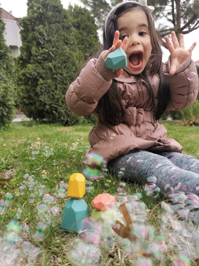 За нас като възрастни може би изглежда безумно, но за децата е напълно възможно синият камък да е таткото, зеленият майката, а розовото камъче – детето. И така да се заформи една игра, в която аз с нетърпение чакам да узная какво казва майката на таткото и детето например, защото често чувам собствените си реплики с имитиращ глас и актьорска игра, достойни за Оскар.