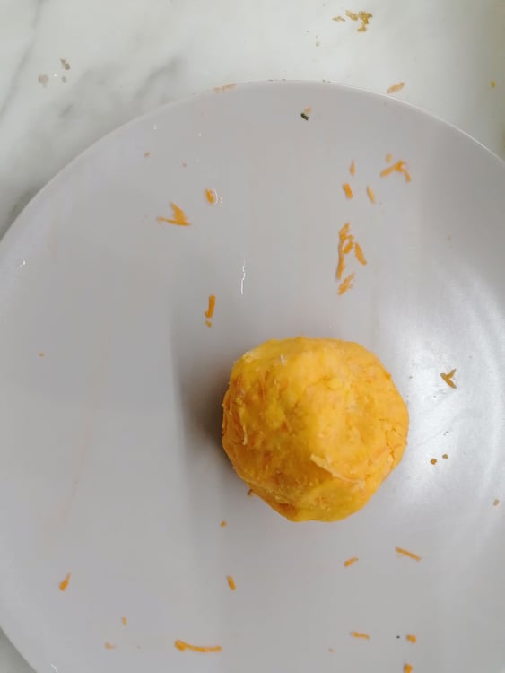 Настъргвах моркова на ситно ренде. Към него добавих жълтъка на едно яйце. Смесих сухите съставки и омесих с морковените стърготини.