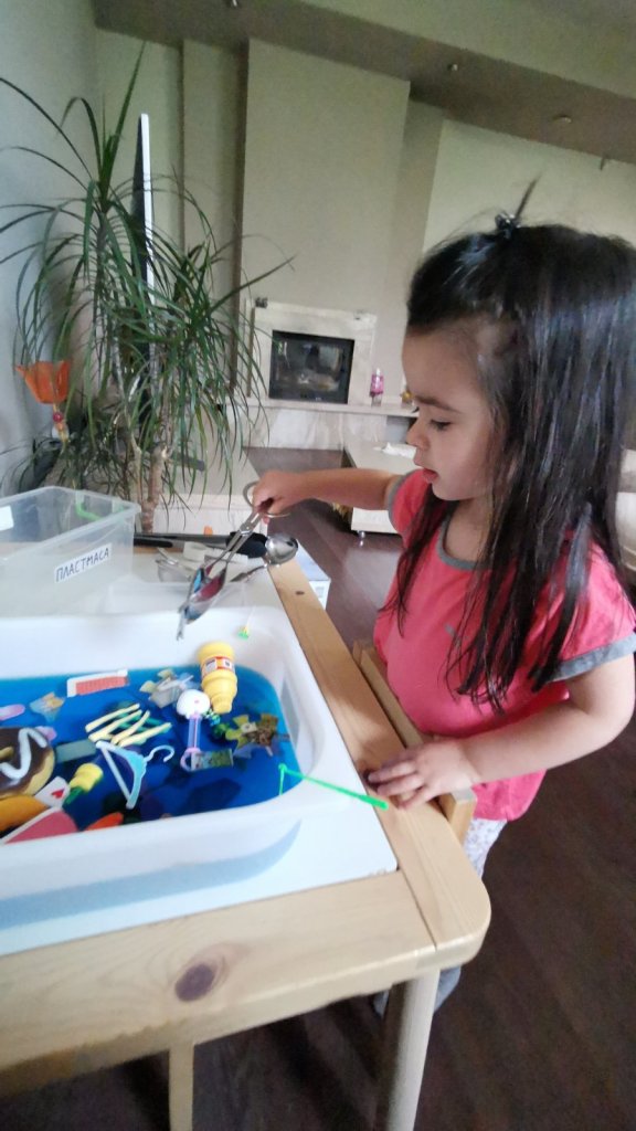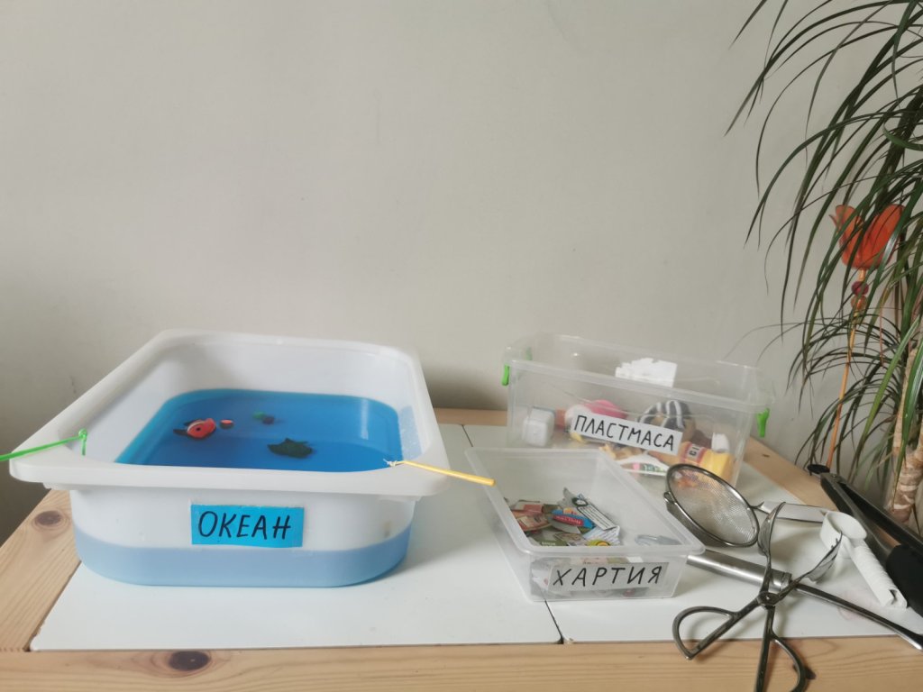 Основната цел е детето да изчисти водата, да рециклира и разпредели различните материали в съответния контейнер. Въпреки че ги надписах, дъщеря ми е едва на 3 и половина и естествено, все още не може да чете. За това предварително оставих една пластмасова играчка в единия контейнер и няколко хартийки в другия, за да й подскажа по този начин кой боклук към кой контейнер да отнася.