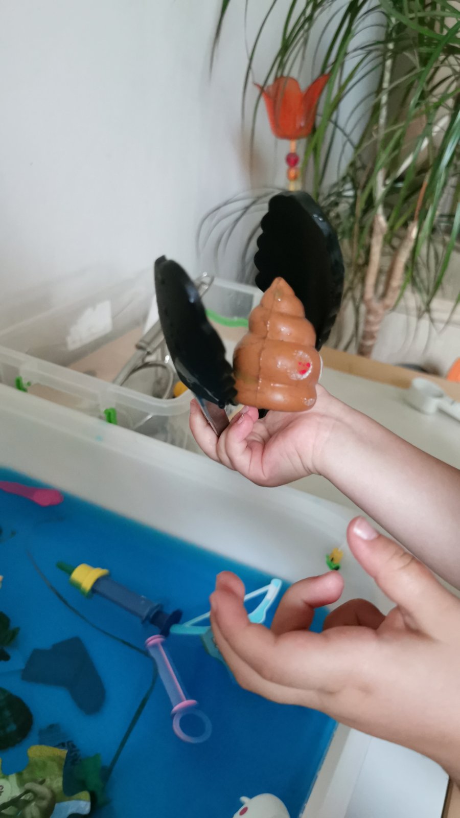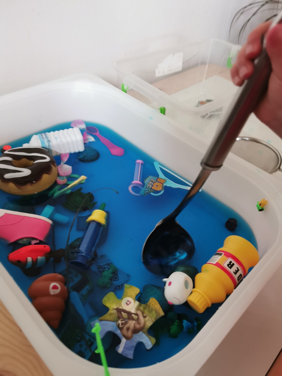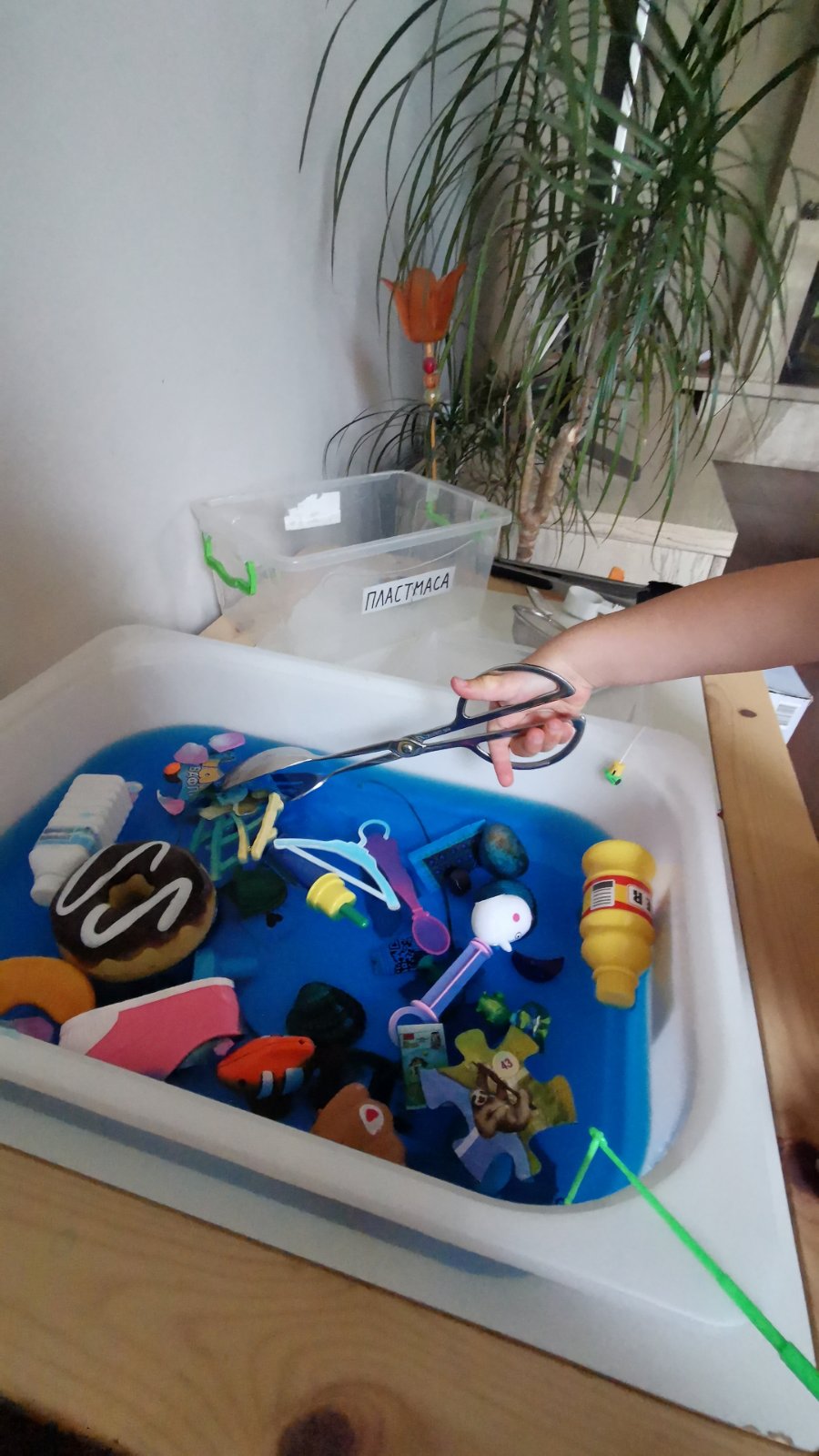 Подбрах и приготвих инструментите за почистване – цедка, черпак, щипки за салата. Предвид това, че познавам дъщеря си, мисля да й дам възможност да си сложи и гумени ръкавици (така ще влезне в роля по-бързо) и да изчисти някои от боклуците с тях. Използвах част от пластмасовите й играчки – като се започне от обувка на кукла, закачалка, дори глава от фигурка на Пепа Пиг.