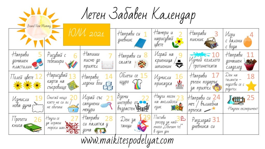 Всеки ден от Юли 2021 ще е изпълнен с нещо забавно, което да обогати детския ден. Така децата имат „проект“, по който да работят и да се забавляват в няколко категории – от творчество (рисуване и съчиняване на приказки), емоционална интелигентност (развиване на емпатия, свързване с другите) до активни дейности (помагане с домакинска работа през игра).