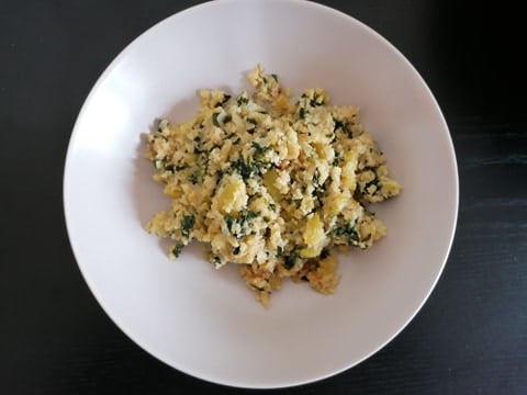 Наситнявате останалите зеленчуци, аз предпочитам да добавя и 1/2 чаша вода, и затваряте тигана с капак, за да се задуши всичко добре. Ако използвате зеленчуци, които не изискват дълга термична обработка (спанак, тикчивка, броколи), обяда е готов за нула време.