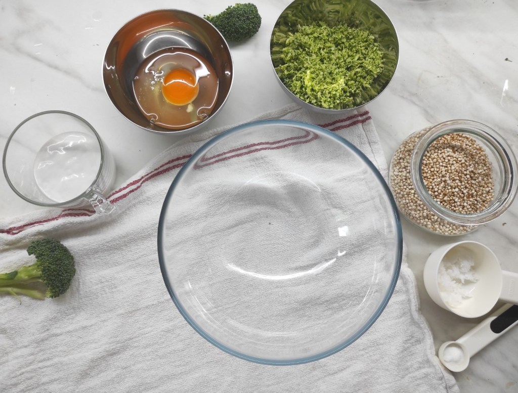 Първо смесих течните съставки в голяма купа и разбърках енергично. Добавих зеленчуци и безглутенова пукана киноа. Може да я замените с овесени ядки, сварено просо или да пропуснете тази стъпка.