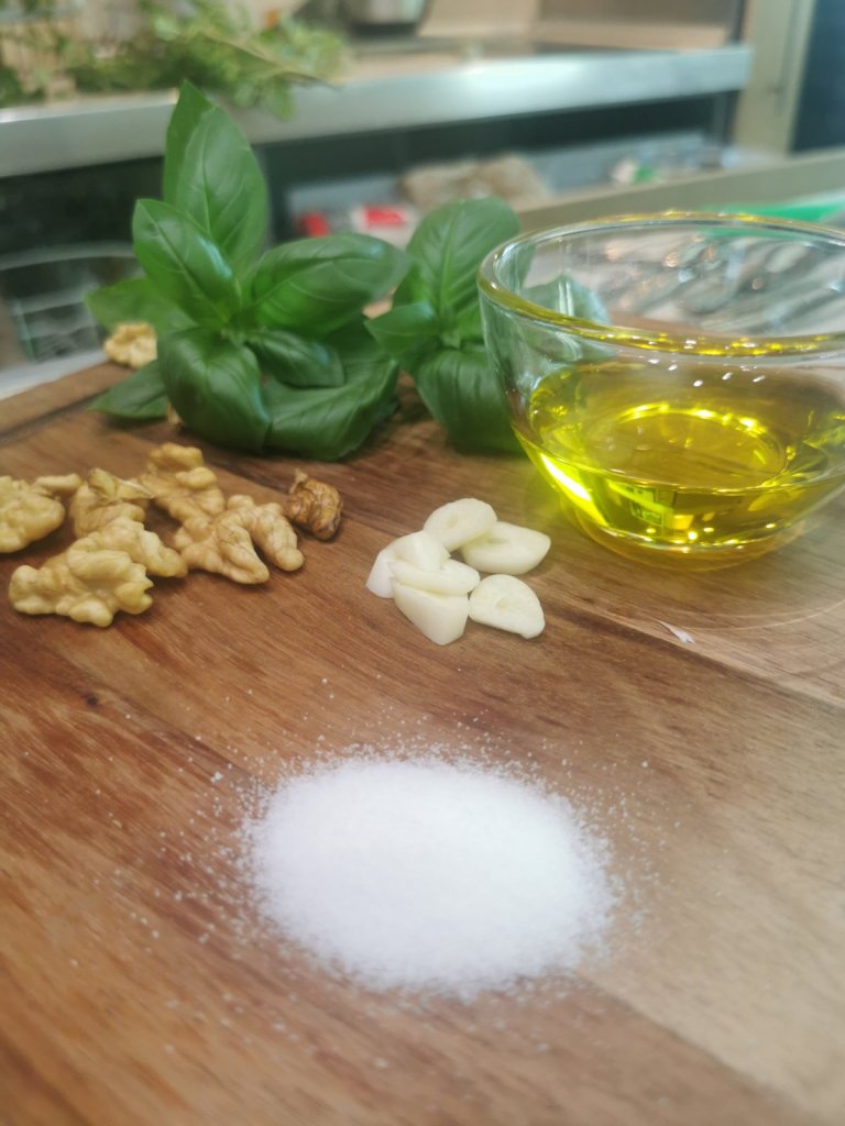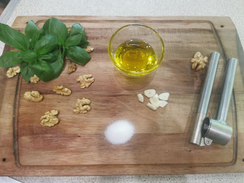 Ако решите да е с орехи е добре да ги накиснете за 16-17 часа в хладка вода (орехите са сурови). След това трябва да ги обелите. ДА, доста е досадно, но пък съм пробвала и да не ги беля и в пестото остават леки власинки, които не ми допадат. Ако във вашия дом нямате против – не ги белете.