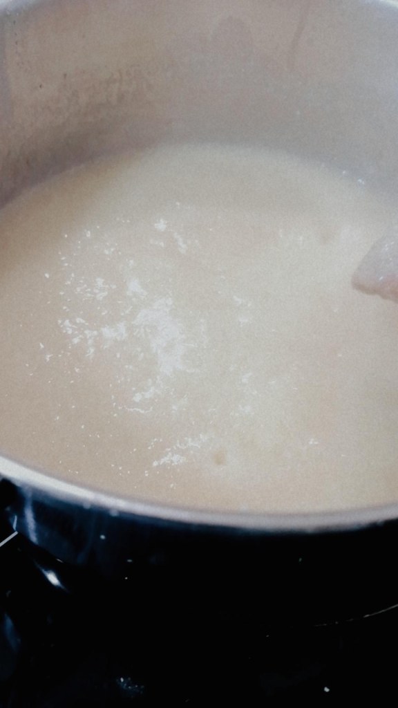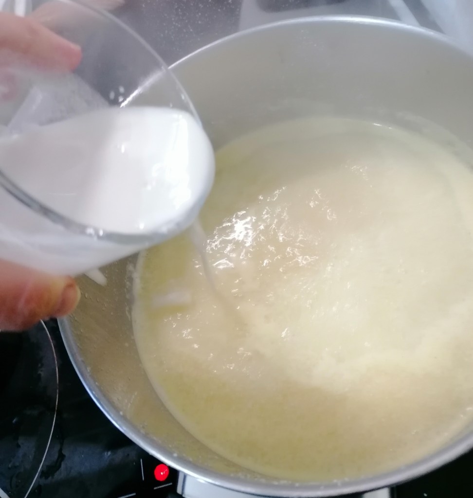 Започвам като загрявам млякото – може да използвате краве, но може и да се спрете на някое ядково като кокосовото например. Ако все още е рано да предложите на любимото бебе млечни продукти или ядкови млека, пригответе рецептата с ВОДА!