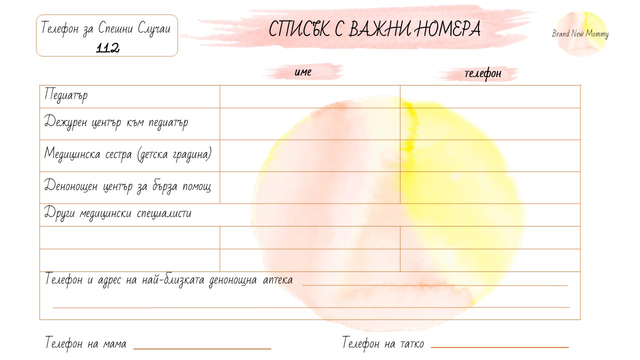 Списъкът с важни телефонни номера може да оставите на бабата, дядото, бавачката или друг човек, който поема грижата за детето ви в даден период. Може да го използвате и за свое спокойствие и организация като го сложите в папката със здравните документи на детето или по преценка го закачите на видно място в дома си (най-честата „жертва“ на всякакъв вид бележчици и напомняния по стара традиция става хладилникът).