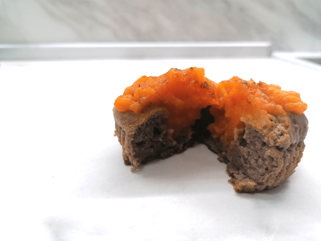 Оставям кексчетата да се поохладят леко и пълня с плодово пюре. Глазирам с още от пюрето и поръсвам с брашно от Рожков. За още по-топъл аромат може да се поръсят с канела.