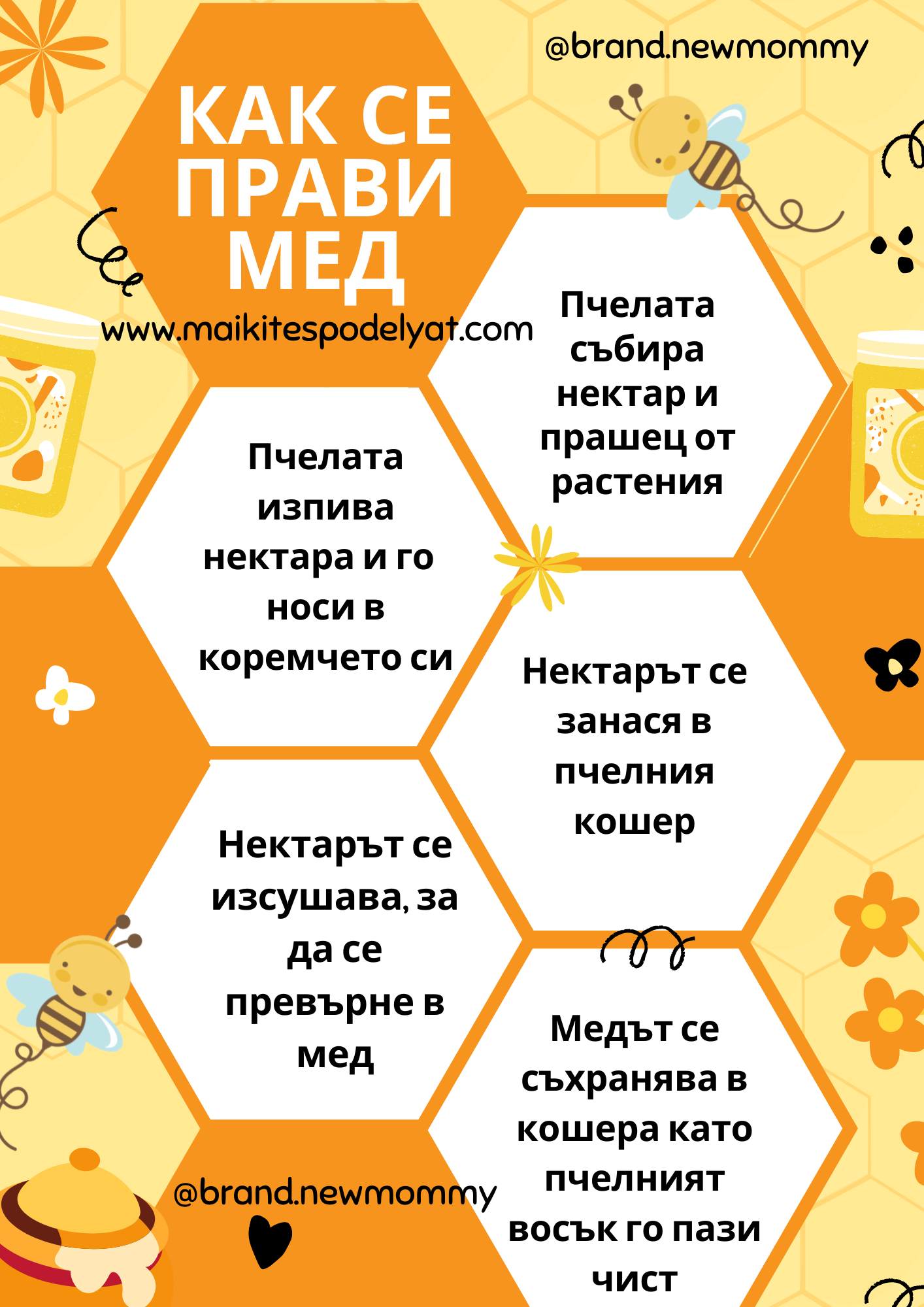 Ресурсът е подходящ за беседи по темата как пчелите правят мед. Детето може да проследи стъпките логически, а изображението прилича на пчелния кошер.