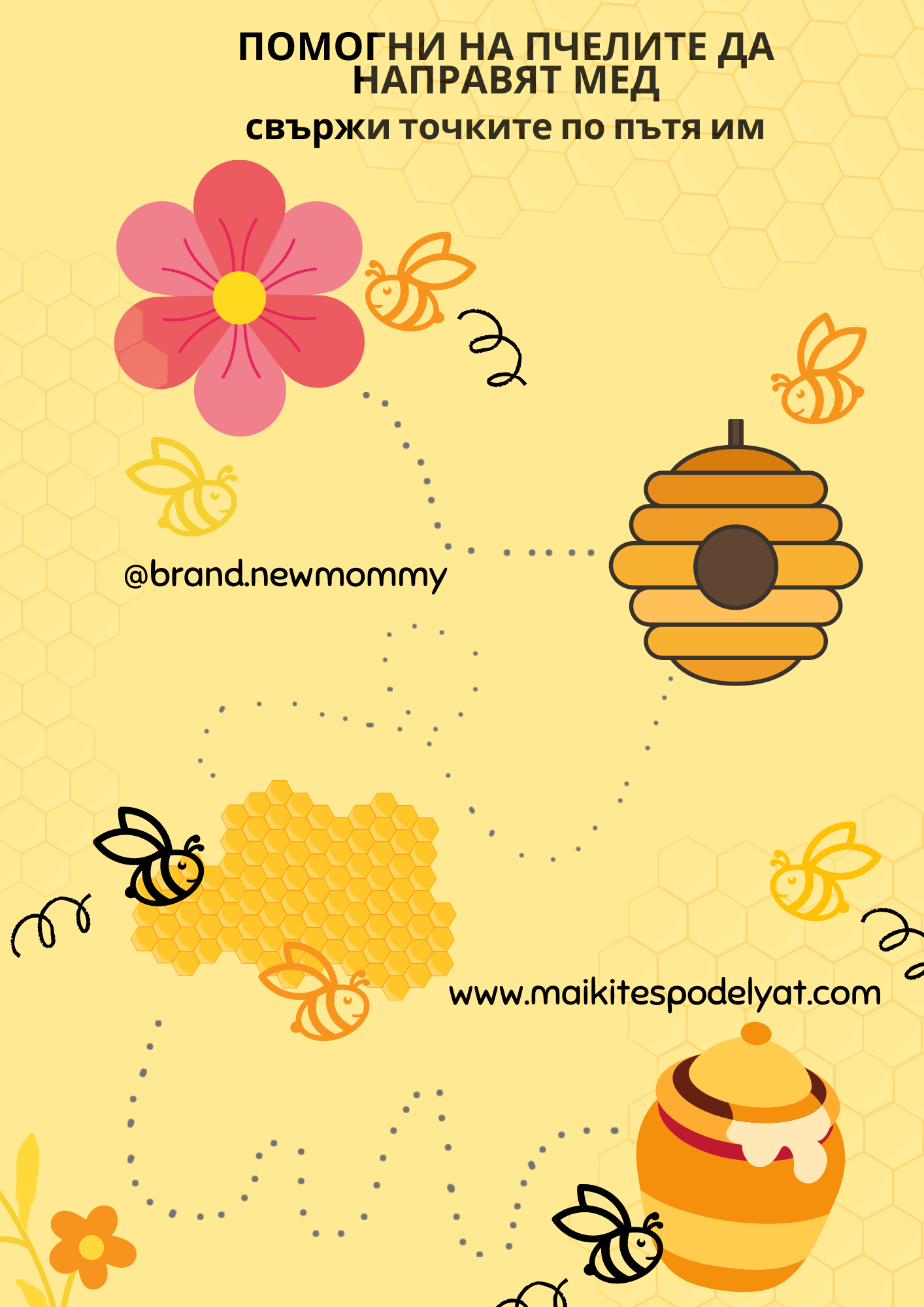 Този материал може да се използва за упражнение на фината моторика и тихи игри. Децата могат да проследят очертанията първо с пръст, а по-големите и с молив. Пунктирната линия се усложнява с всяка стъпка, като детето внимателно следва да свърже точките, без да пропуска нито една. Докато трае заниманието, може отново да се обсъди пътят на меда от цветето до закуската на децата.